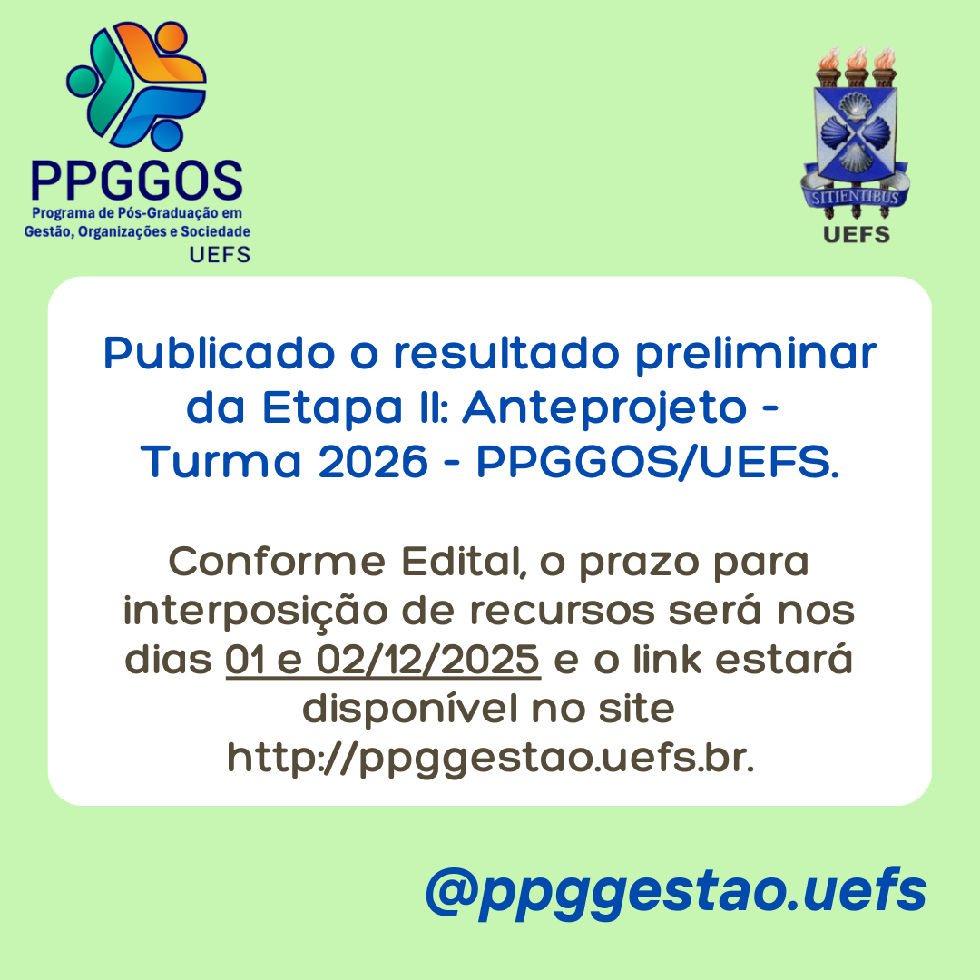 Resultado preliminar da Etapa II: Anteprojeto – Turma 2026 – PPGGOS/Uefs