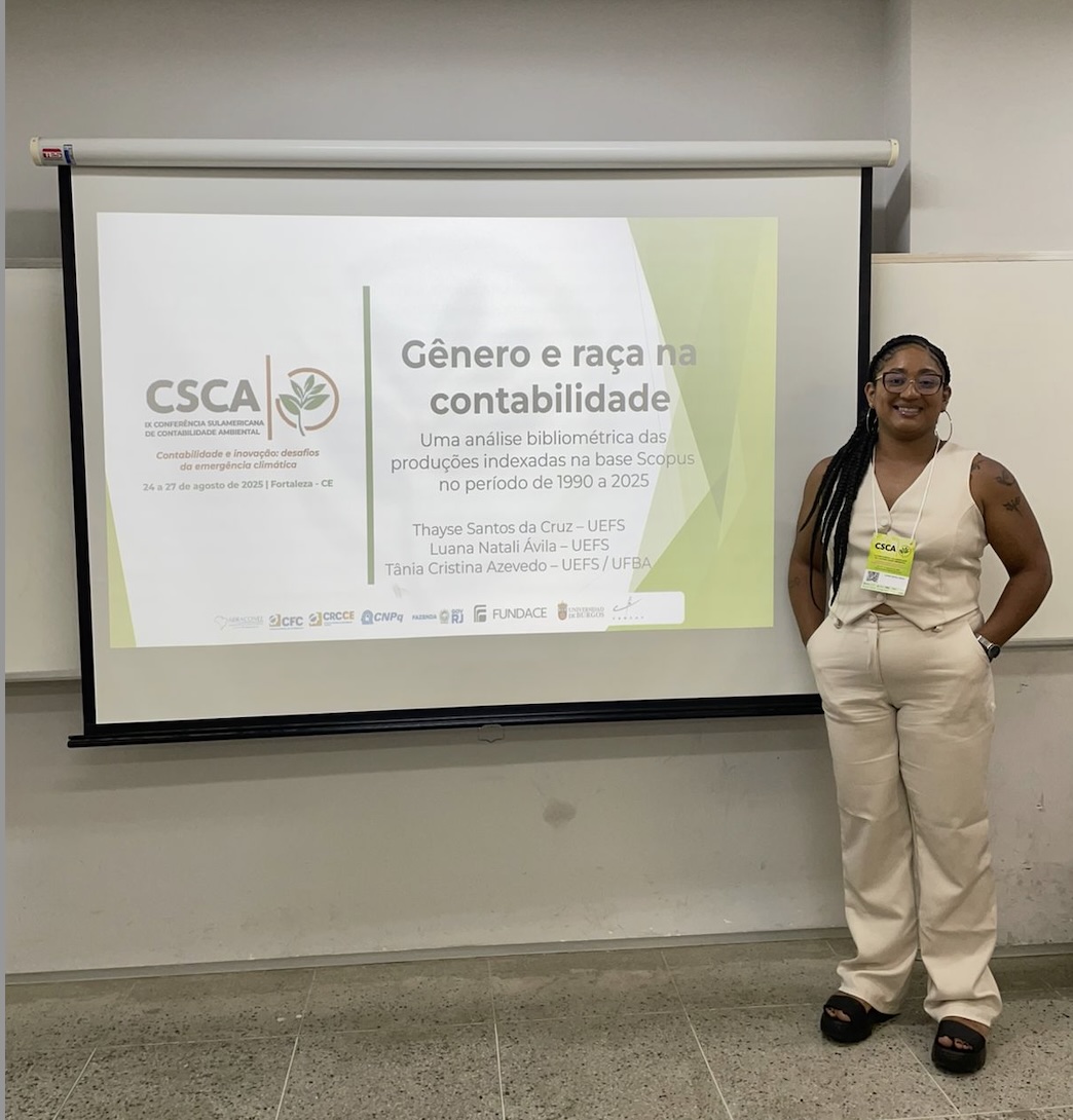 O Programa de Pós-Graduação em Gestão, Organizações e Sociedade da Universidade Estadual de Feira de Santana (PPGGOS/Uefs) esteve presente na CSCA, com a participação da mestranda Luana Natali Ávila, que apresentou o artigo “Gênero e raça na contabilidade: uma análise bibliométrica das produções indexadas na base Scopus no período de 1990 a 2025”, desenvolvido em coautoria com as professoras Thayse Santos da Cruz e Tânia Cristina Azevedo, todas integrantes do grupo de pesquisa Gestão, Contabilidade e Sustentabilidade em Organizações (GCSO) e membros do corpo docente do PPGGOS.