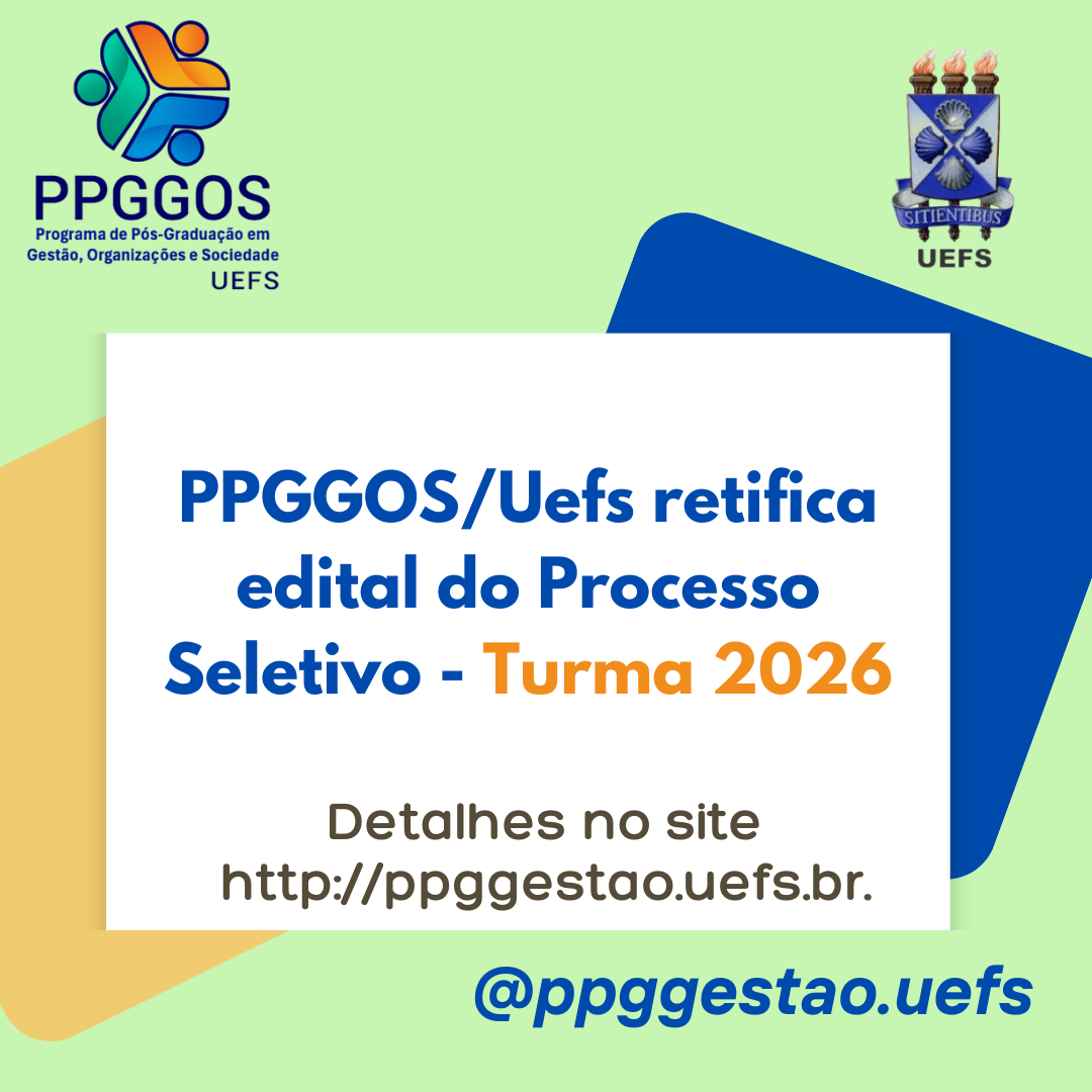 O Programa de Pós-Graduação em Gestão, Organizações e Sociedade da Universidade Estadual de Feira de Santana (PPGGOS/Uefs) torna pública a retificação ao edital de abertura de inscrições para a seleção de candidatos(as) ao mestrado acadêmico do Programa – Turma 2026. Foram feitas duas alterações: